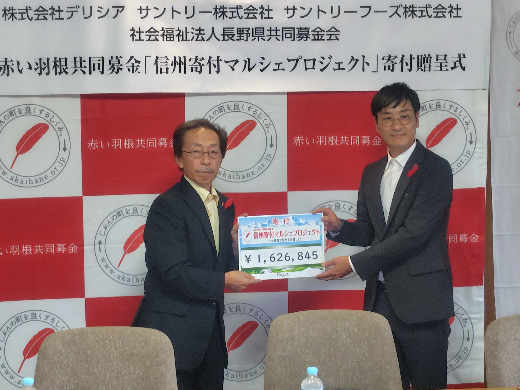 長野県共同募金会 会長 合津文雄が株式会社デリシア 代表取締役社長 森真也様から寄付金1,626,845円の目録を受け取り、お礼として感謝状を贈りました。