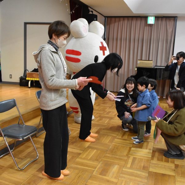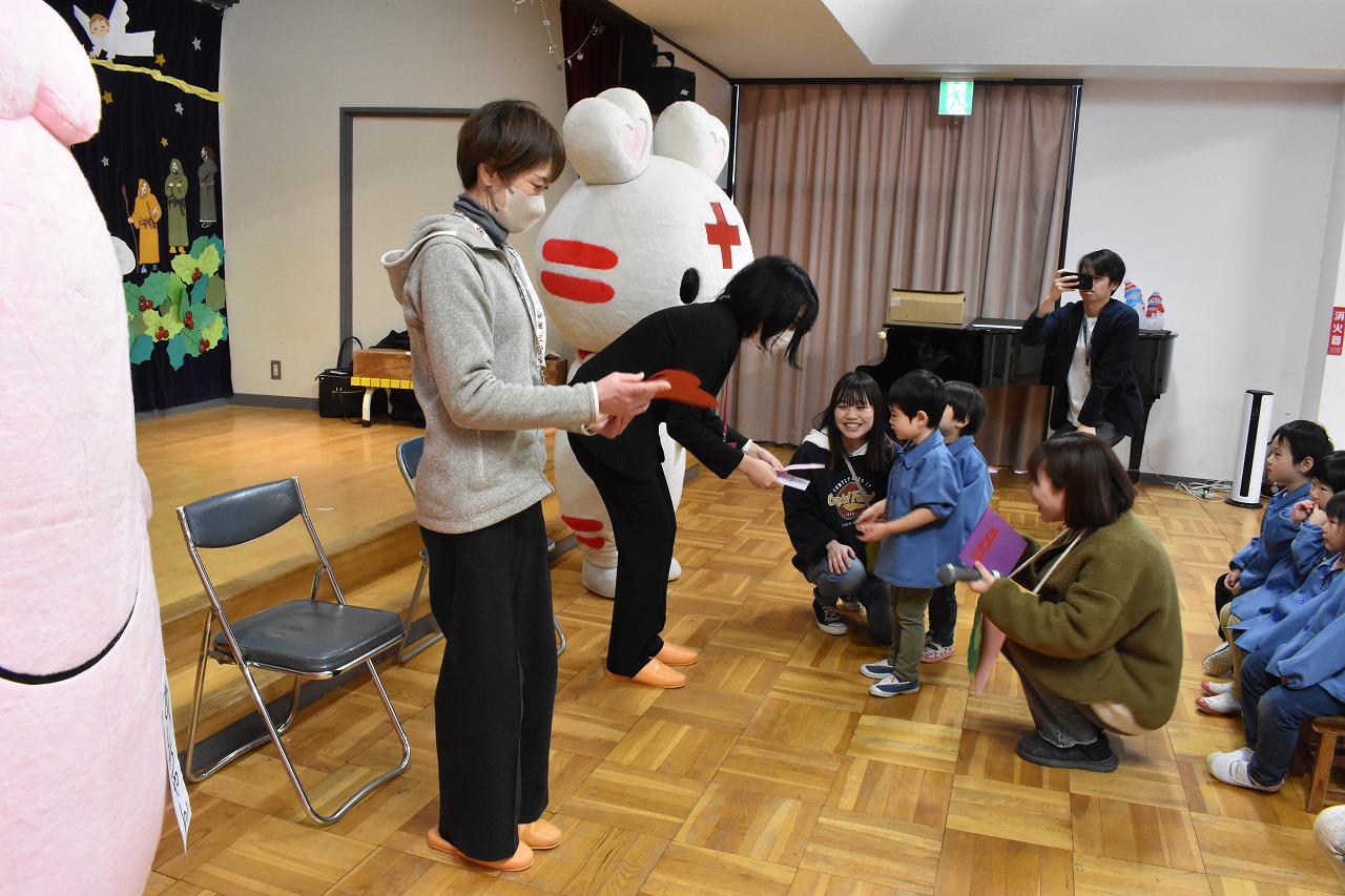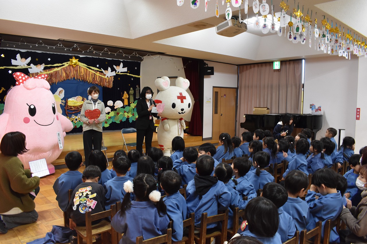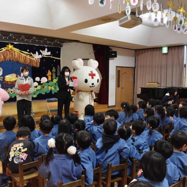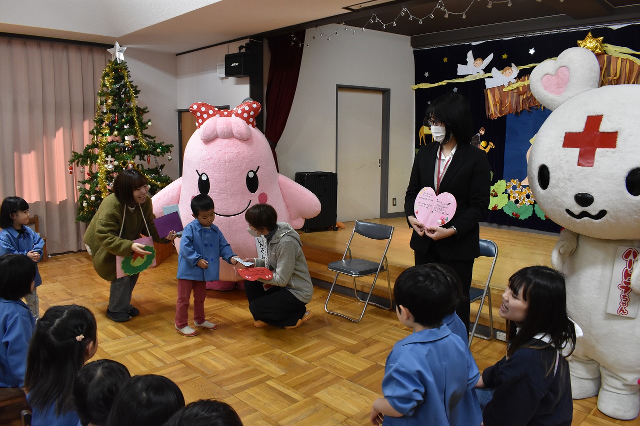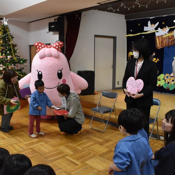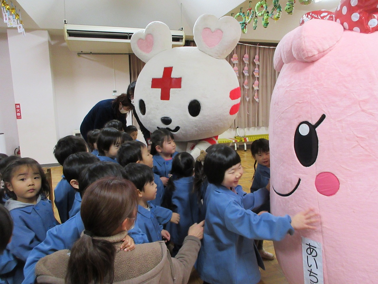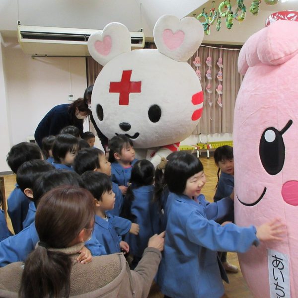 当日は、園児の皆さんが「愛ちゃん」「ハートラちゃん」とふれあい、最後には一緒に笑顔で記念撮影を行うなど、和やかな時間となりました。